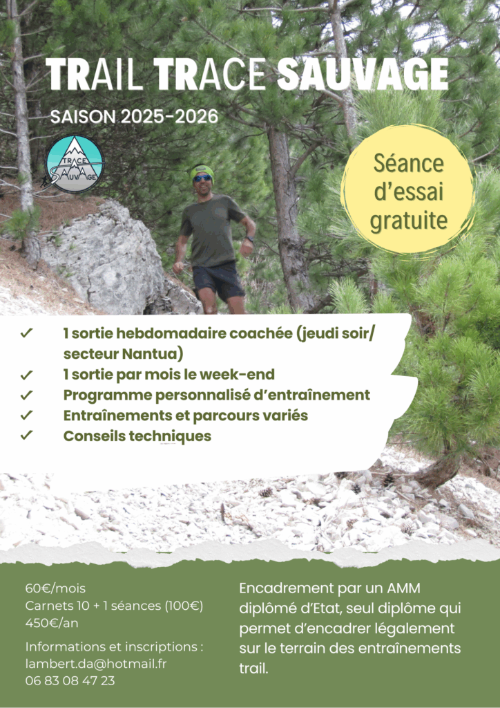 Entraînements trail tous les jeudis soirs à 18h00 et rando-course certains week-end.